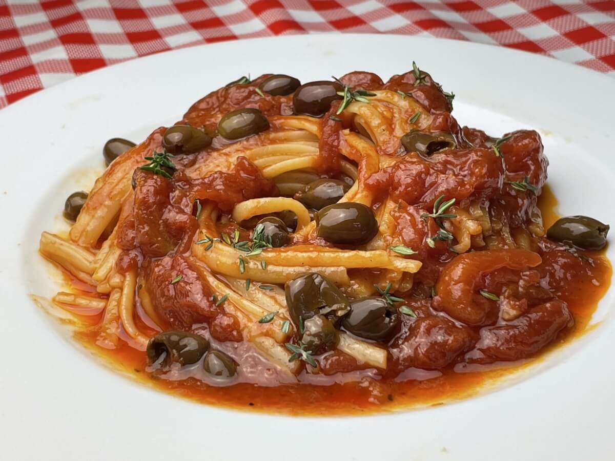 Der Padrone hatte so spät nicht mehr viel anzubieten und einer der Gäste meinte sodann, er solle doch eine „puttanata“ also irgendeinen „Mist“ kochen, so dass der Koch aus den Resten des Tages die Spaghetti alla Puttanesca kreierte.